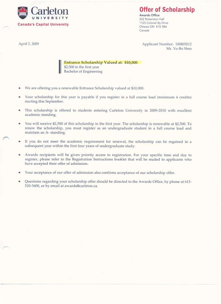 沈裕博同学 - Carleton University 奖学金