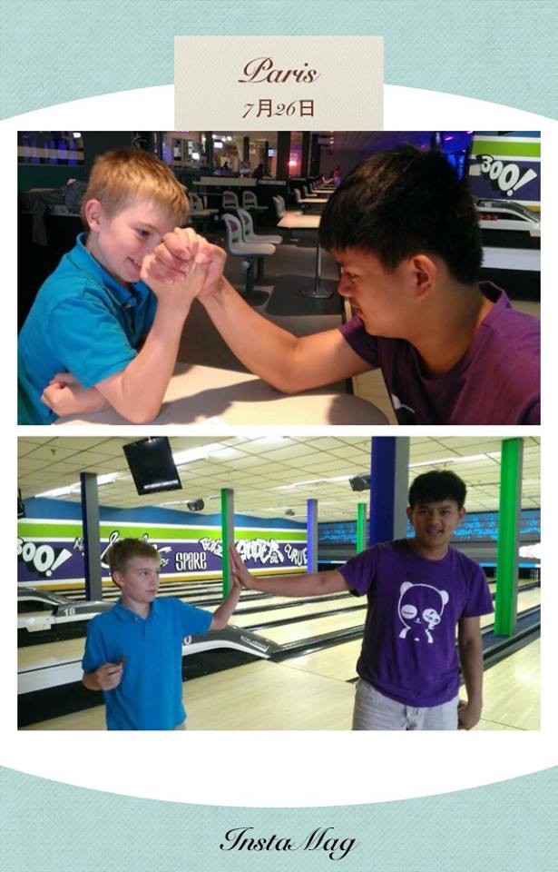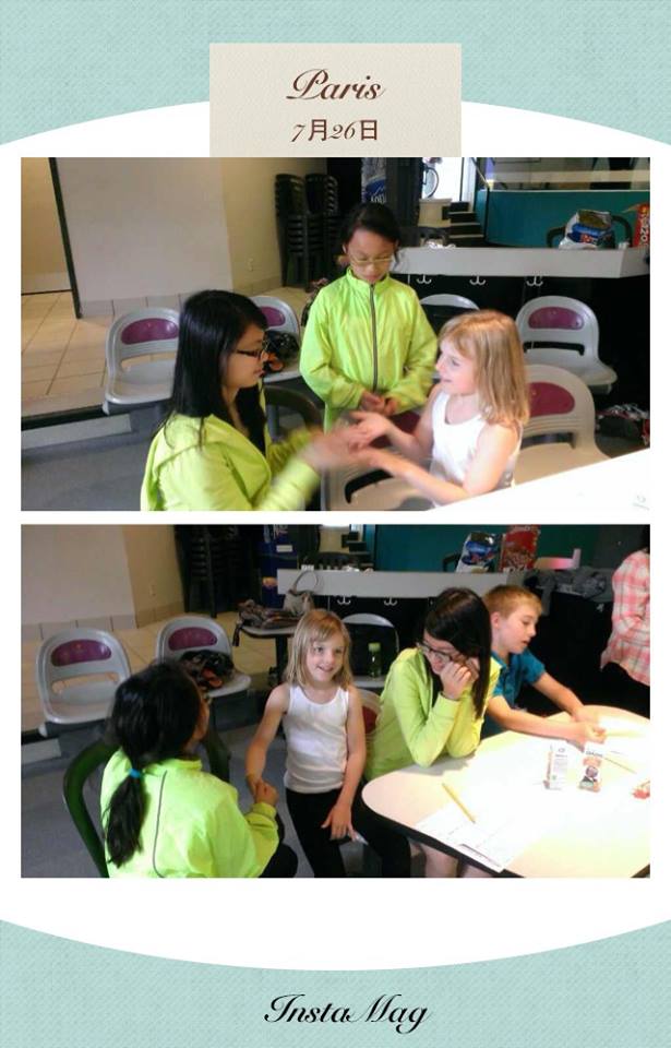 然後,孩子們和一位同年齡的Eric玩遊戲,他和昕穎一組,勝利時還高興地和昕穎撃掌,孩子們説Eric學他們講中文:“好猛",我們的孩子才真的好猛!同化了同伴,而且他還主動把自己的FB帳號給我們的孩子,願這份友誼就此開展下去!