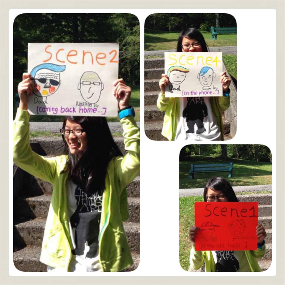 三人抽簽決定到Dingo Park的涼亭去做這場表演。豪弟飾演單親父親,特地在臉上畫刀疤,突顯戲劇效果。劇情總共有七個場景,英文老師用滑稽的動作示範換場標語,孩子們也輪流即興表演,自然又生動!
