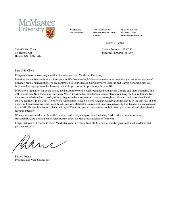 陳世杰同學 - McMaster University 申請成功