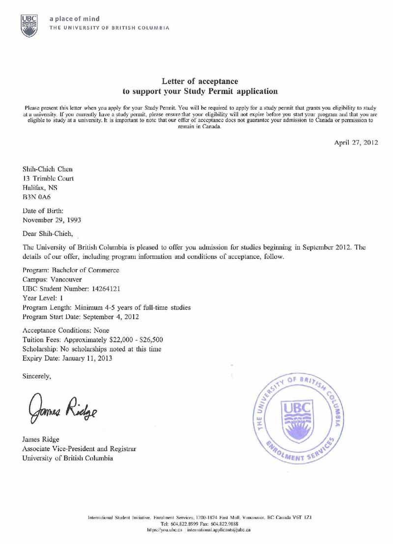陳世杰同學 - UBC University 申請成功